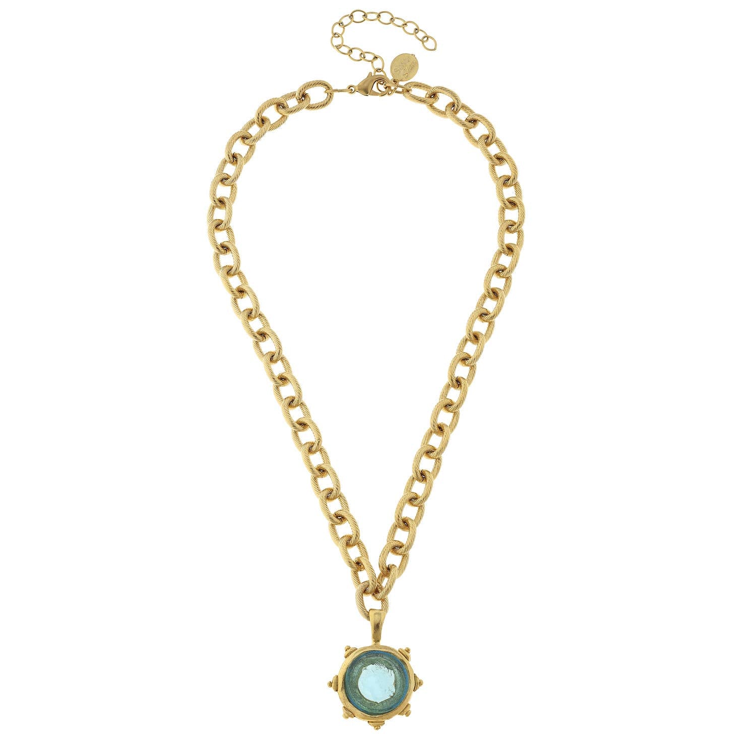 Experience the allure of the Aqua Venetian Small Glass Coin Intaglio on Gold Chain Necklace by Susan Shaw. This Pendant/Charm Necklace is an expression of elegance, crafted meticulously by experienced artists in our boutique workshop. Drawing inspiration from Northern European styling, it's designed to meet the needs and desires of our customers. We're proud to say our jewelry graces some of the finest boutiques and gift shops across the US, including notable accounts like The Cloister and Waldorf Astoria Resorts. This piece truly exemplifies our commitment to quality and unique design.