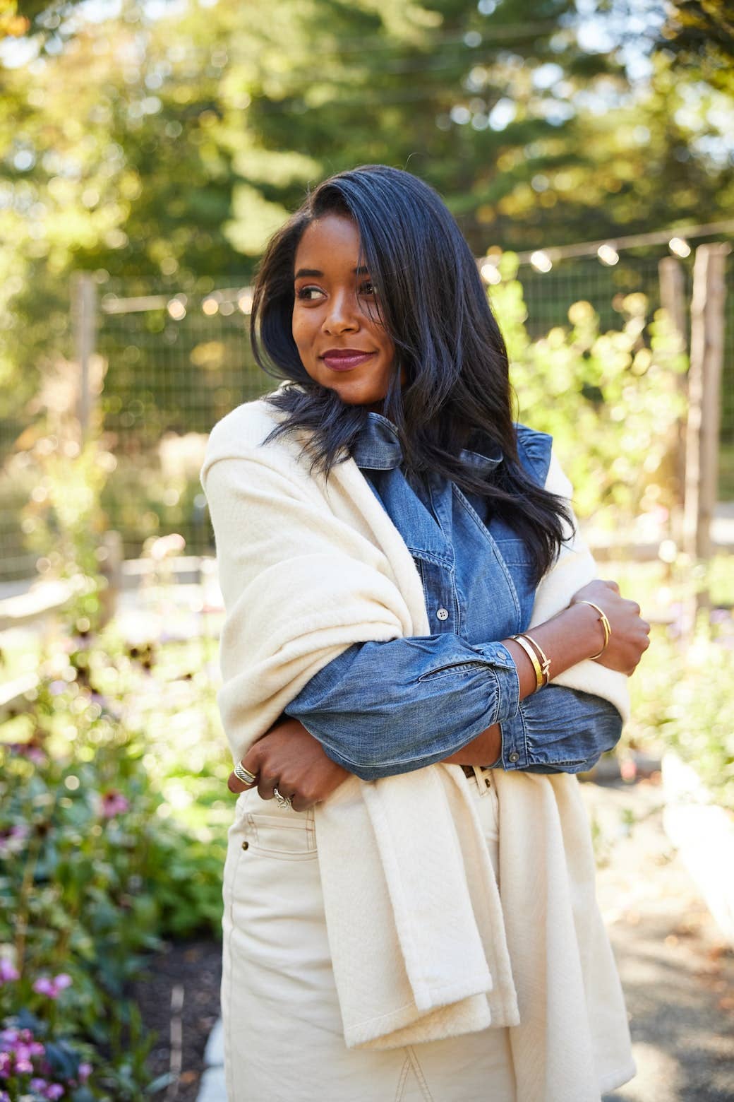 We lightened up our signature, super-soft cotton blend fabrication a little for ideal street-worthy, style-ready wearability. * Size: 29" x 75" * Cream and ivory * Machine wash and dry * No pilling, shrinking or fuzz * Reversible, Jacquard-woven design * Natural cotton blend: 58% cotton 35% acrylic 7% polyester