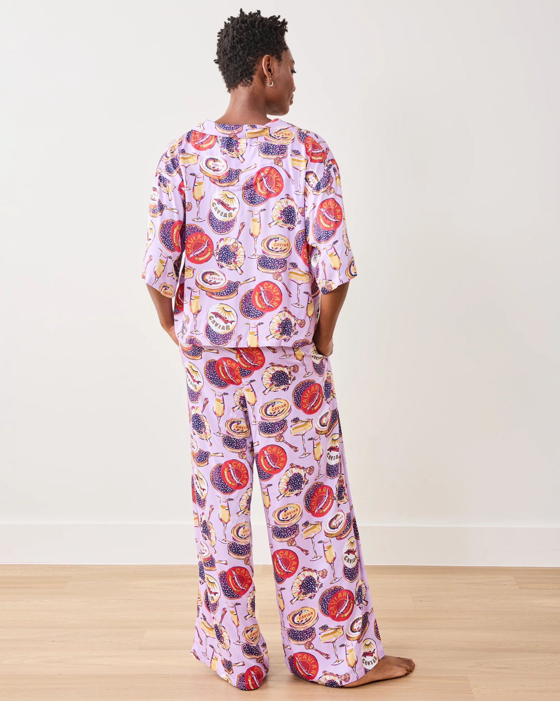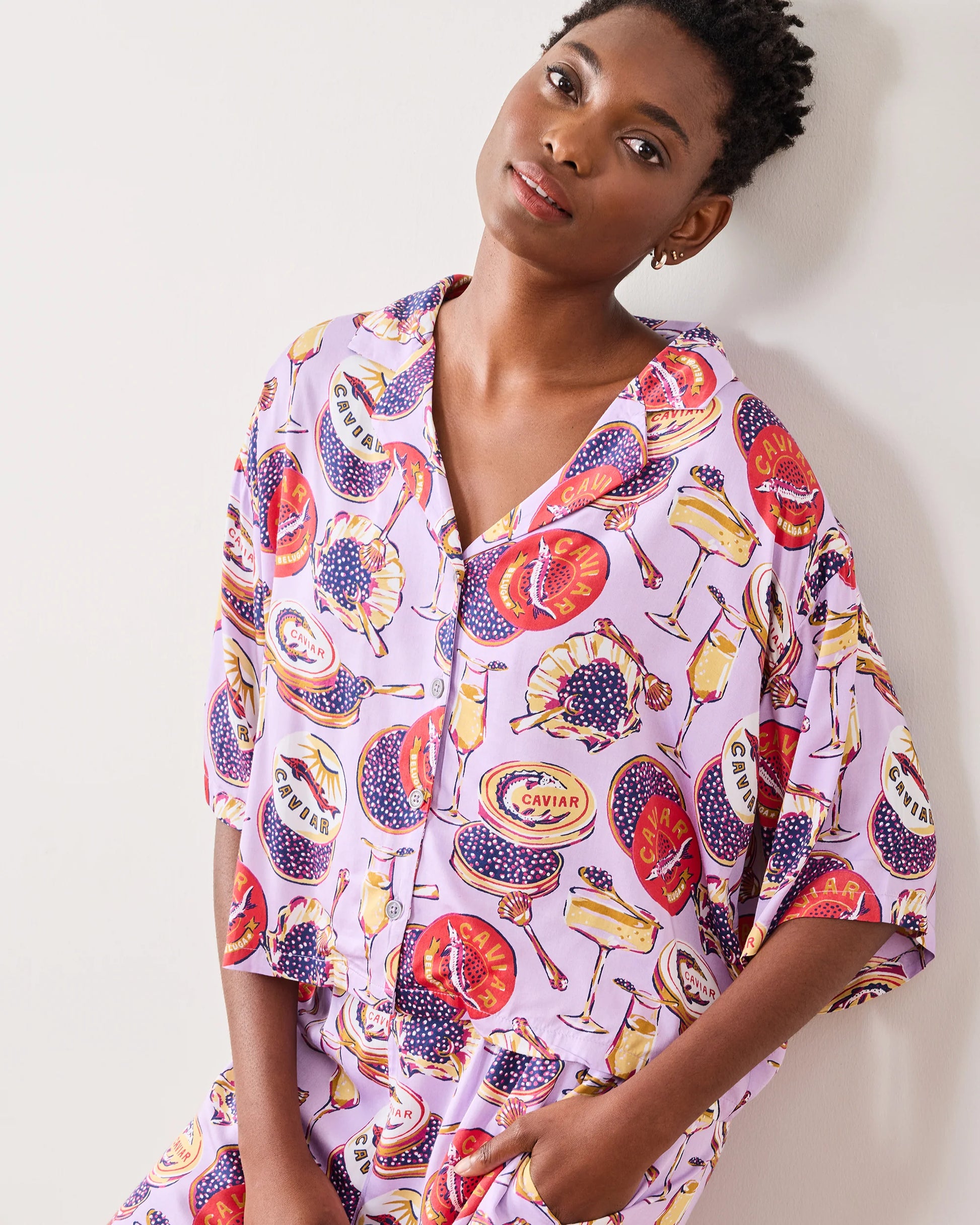 Fit: Oversized slightly boxy top that hits at natural waist with loose, comfy sleeves. Wide-leg pants with higher rise featuring elastic waist and pull-on design with deep pockets. 26.5" inseam.