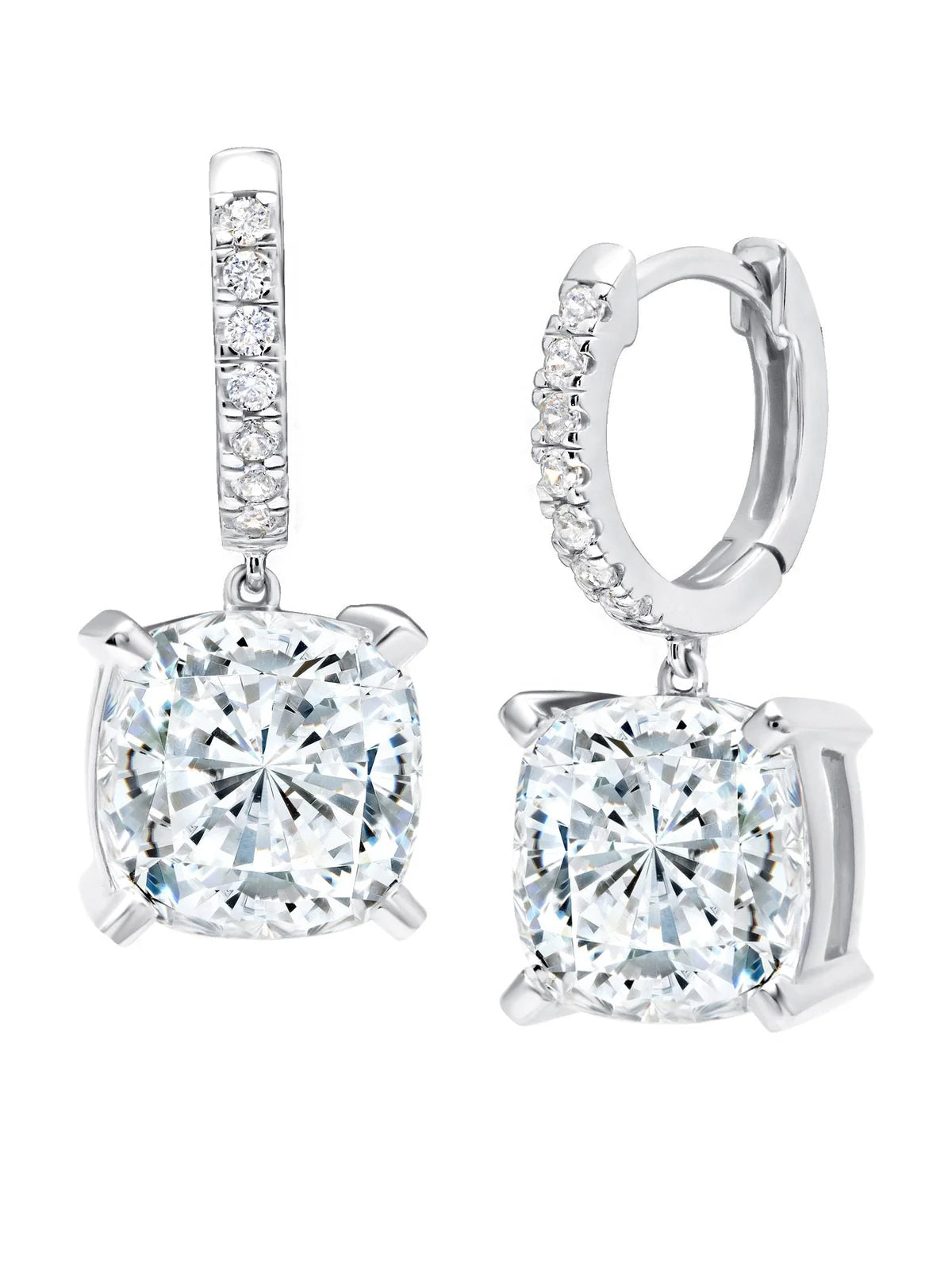 These drop earrings feature cushion cut cubic zirconia on a pave huggie, for a total carat weight of 8.25. These earrings are crafted in .925 sterling silver finished in pure platinum, with flawless handset cubic zirconia.