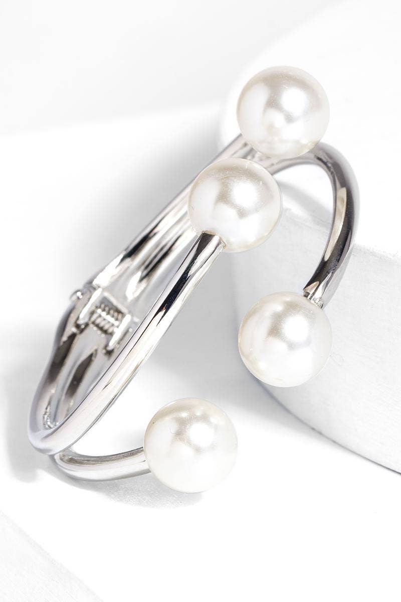 our Hinged Pearl Cuff is a classy, sophisticated everyday staple. This structured cuff features an open silhouette that's tipped with sizable pearls at every end. Whether worn solo or stacked with other bracelets, we just know you'll reach for this pretty pearl cuff again and again. "-Material: Genuine Pearl -Diameter: 2.5" -Hinged Closure -Imported"