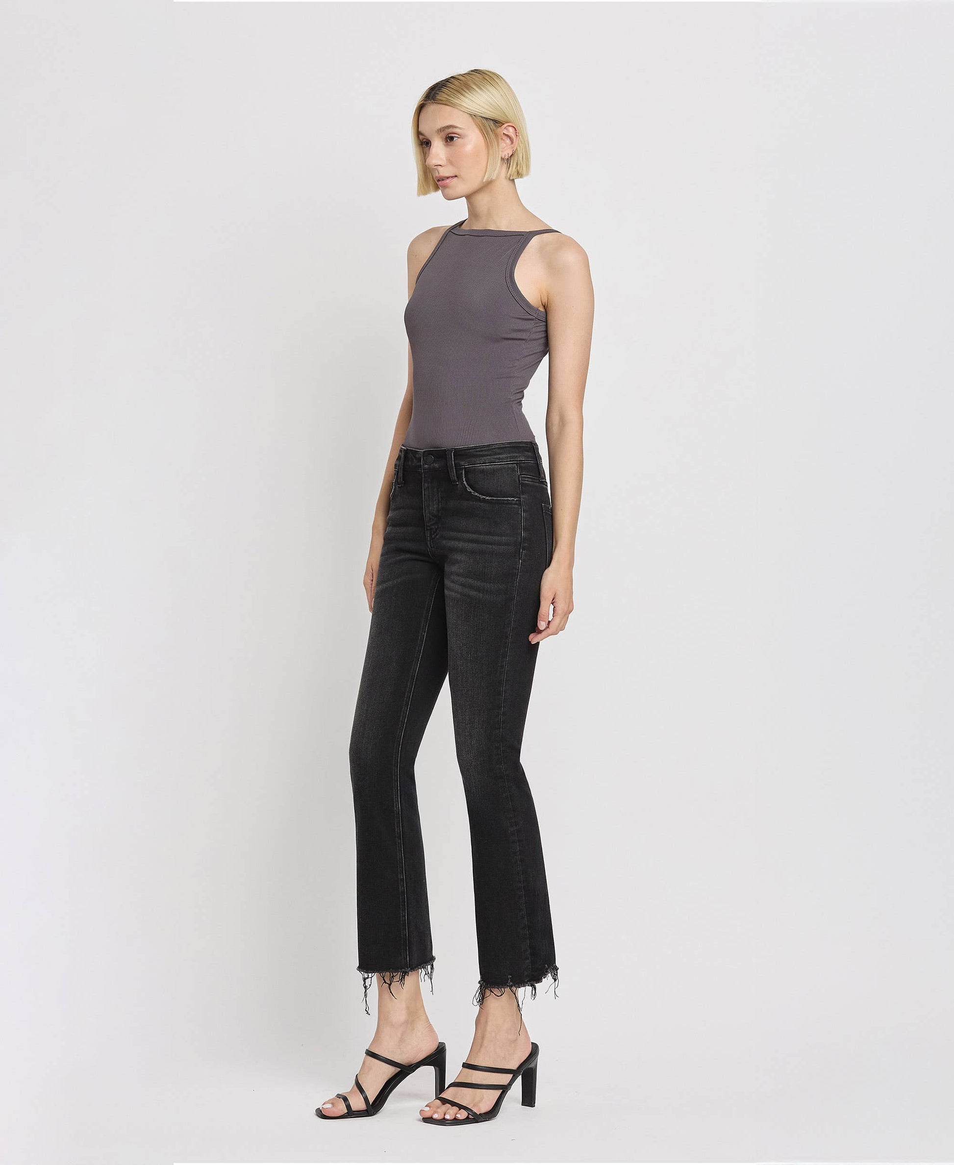 COMFORT STRETCH DENIM, MID RISE WAIST, RAW DISTRESSED HEM, CROPPED LENGTH, FLARE JEANS